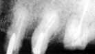 図8.術直後 頬側の骨は比較的高い位置まで残存して いたが、口蓋側では根尖1/4相当部まで 骨が欠損していた。 X線的にも歯槽硬線 の破壊が著明であった。 |