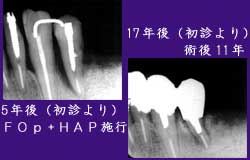長期間の保存が見込まれる。Fop+HAP を行った前歯部も経過は比較的良好である。歯周外科処置